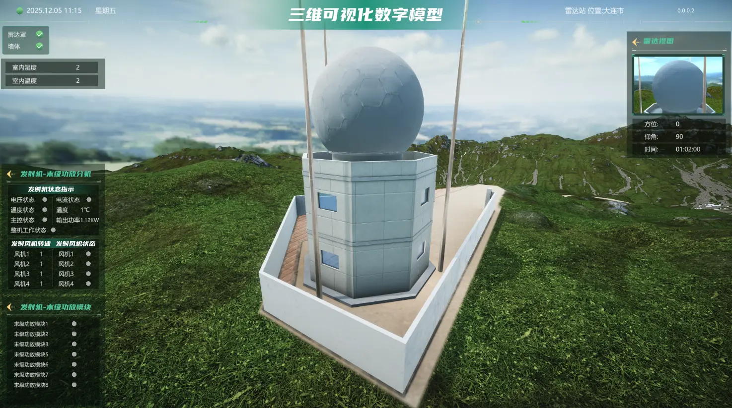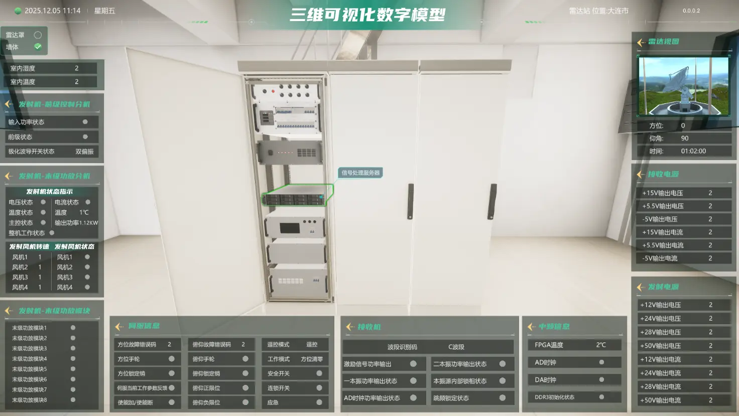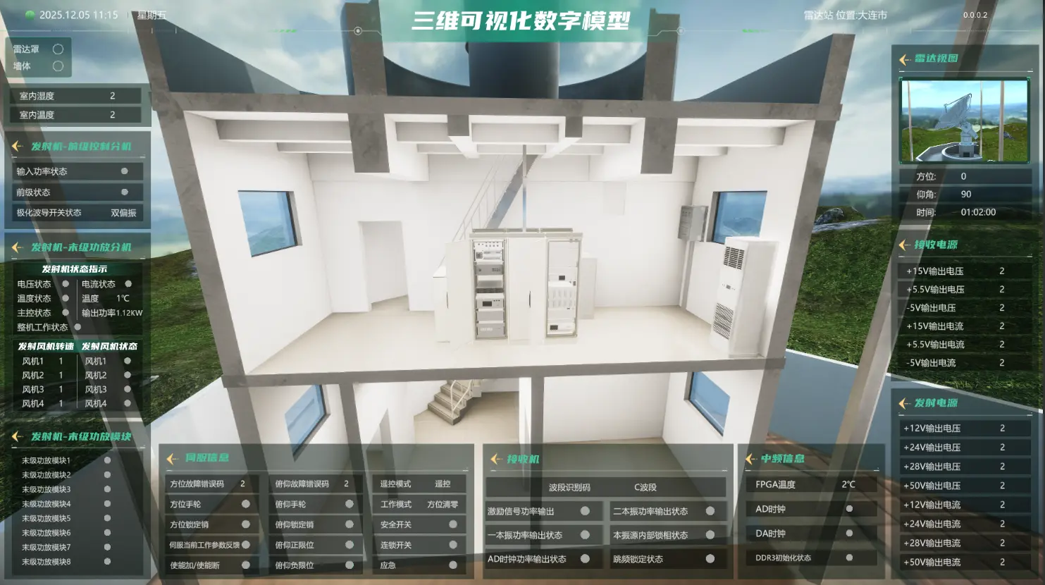 软件核心功能在于实现气象雷达的数字孪生映射与实时状态监控。它通过UDP组播实时接收并解析实体雷达的内建测试(BIT)数据(包括发射机、接收机、伺服、电源等分系统状态)以及俯仰方位数据,并驱动三维模型进行同步运动与状态更新。当雷达各分系统出现状态异常或故障时,三维界面中的对应部件会实时高亮(如变为红色)并弹出告警提示,实现了故障的快速定位与可视化诊断。用户可通过点击打开虚拟机柜门,进一步查看各分机(如发射电源、接受信息处理分机、功放分机等)的详细参数面板,所有数据均实现实时更新显示。