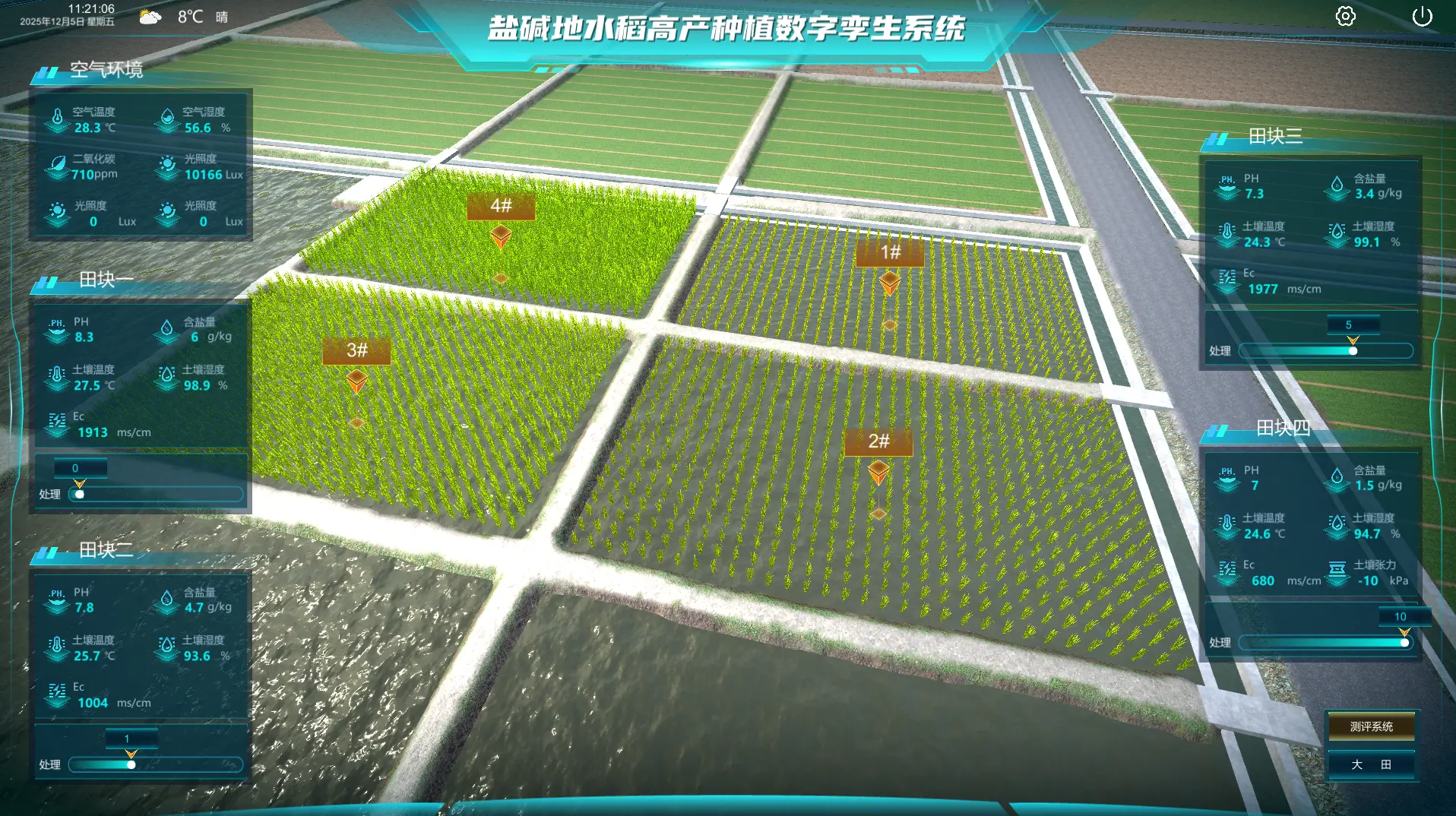 系统核心围绕四块独立田块展开,每块田均具备独特的土壤理化参数,包括PH值、含盐量、土壤温度、土壤湿度以及电导率(EC),这些差异化的基础数据直接驱动了各田块中水稻生长的虚拟模拟,导致其长势、叶色、株高等表现各不相同。用户可交互式点击选择任一田块,系统将聚焦展示该田块内四种不同水稻品种或栽培处理的生长状态三维模型,支持同屏直观对比,便于进行品种适应性、抗逆性或栽培措施的效果评估。